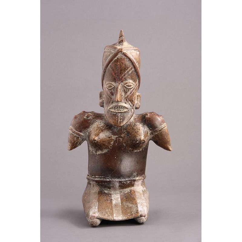 A seated pottery female figure, with slip decoration, 17.25in (44cm) h.