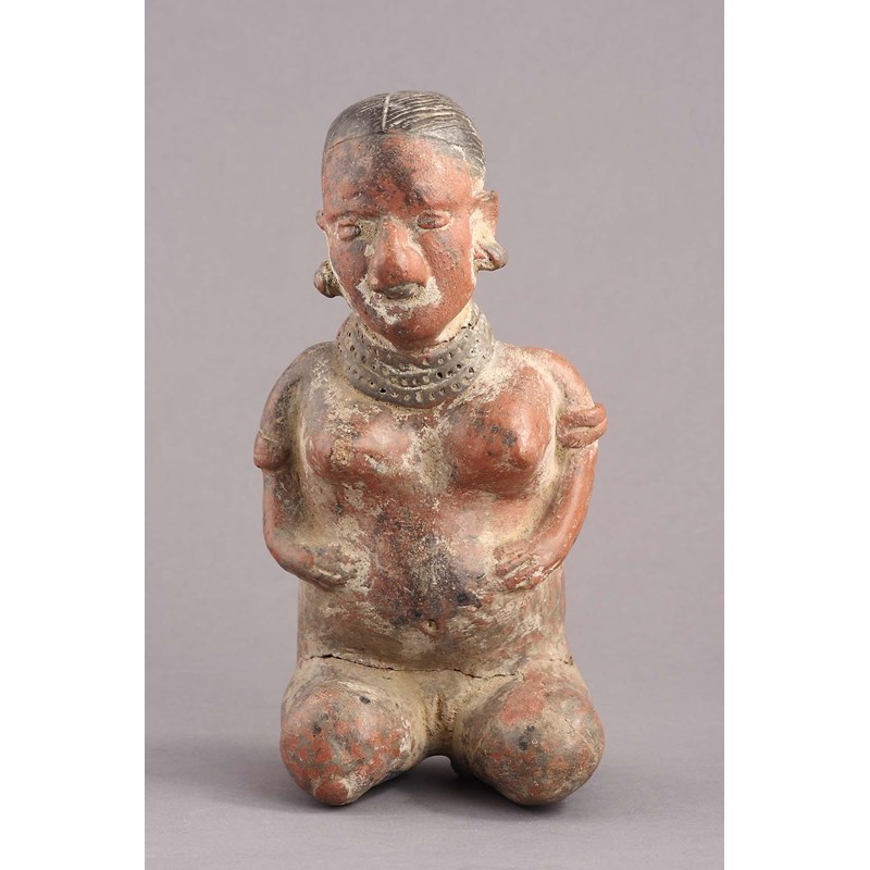A pottery kneeling female figure, wearing a necklace, 9.75in (25cm) h.