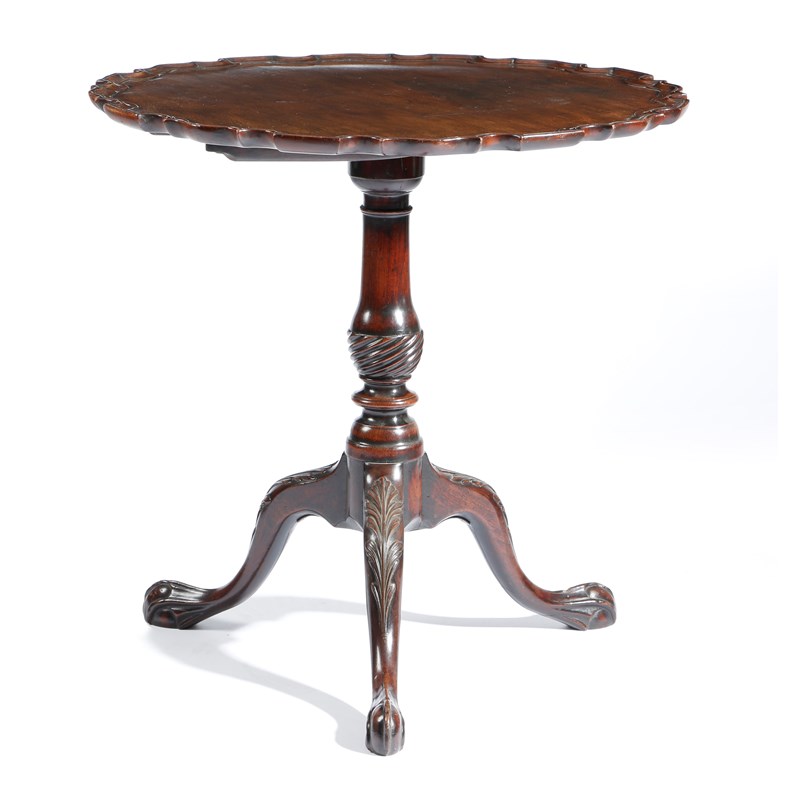 A mahogany pie-crust table, the circular tilt-top with a pie-crust moulded edge, on a turned stem with a fluted bowl, on leaf capped cabriole legs and claw and ball feet, George II and later, 72.3cm high, 72.5cm diameter.