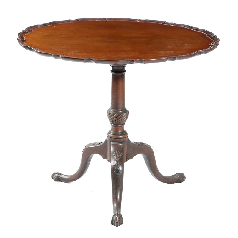 A George III mahogany tripod table, the circular tilt-top with a pie-crust moulded edge, on a turned stem with a fluted bowl, on shell and bell flower carved cabriole legs and claw and ball feet, 75cm high, 86.5cm diameter.
