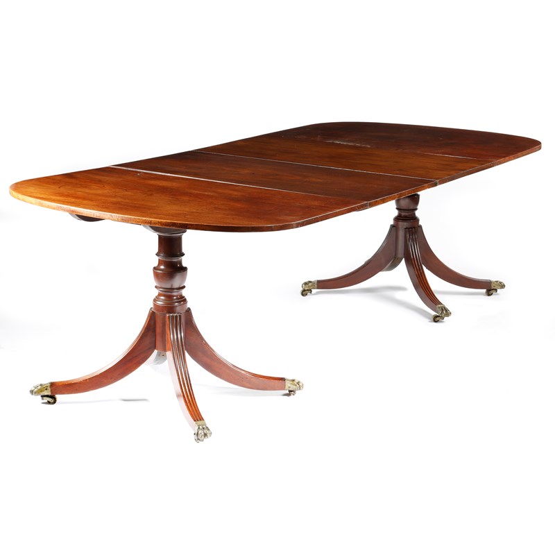 A George III mahogany twin pedestal dining table, with a pair of 'D' ends and two additional leaves, above vase turned pillars and four reeded legs terminating in lion's paw brass sabot and castors, with a Norman Adams trade label 'ANTIQUE FURNITURE from NORMAN ADAMS LTD, 8-10, HANS ROAD, LONDON, S.W.3', 69.5cm high, 230.5cm long, 109.3cm deep.