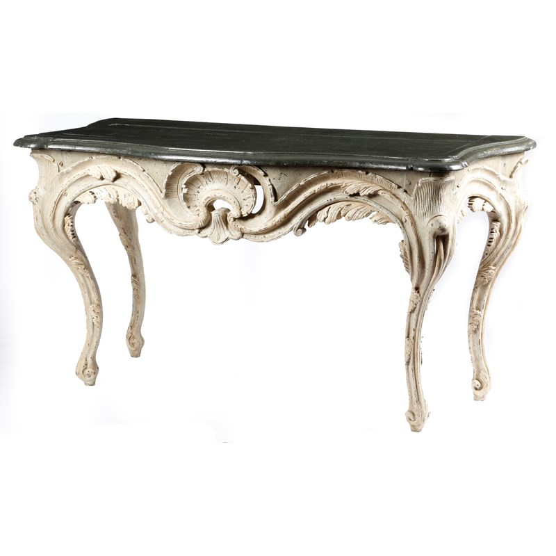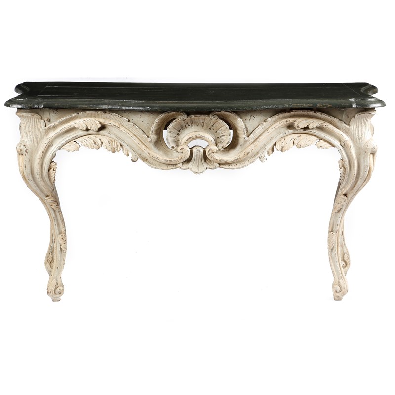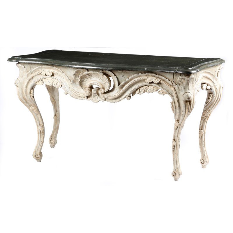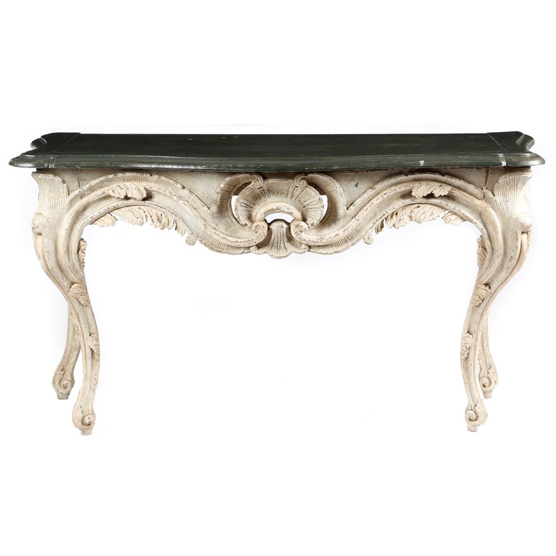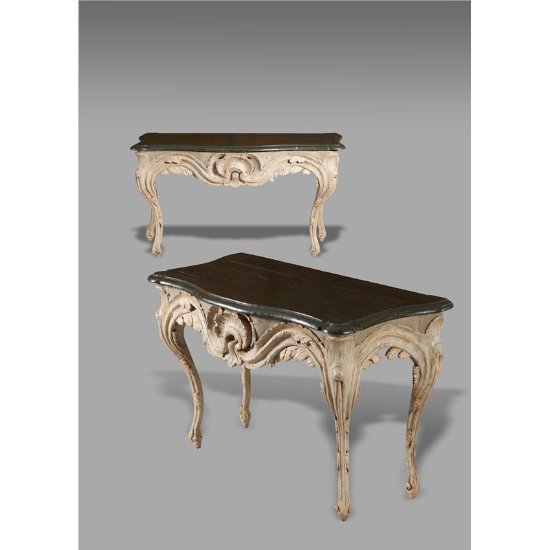 A pair of 18th century and later continental painted and carved wood console tables in Baroque style, each with a serpentine loose top, with a moulded edge, above a shell, leaf and scroll carved frieze, on moulded cabriole legs, possibly Italian or German, 86.3cm high, 158cm wide, 68.4cm deep. (2)