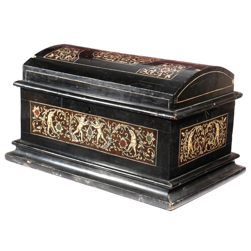 λ A 19th century Italian ebonised and ivory casket, inlaid with marquetry panels of scrolling foliage, with cherubs and coloured dots to imitate precious stones, the domed hinged lid revealing a velvet lined interior, probably Lombardy, 24.4cm high, 44cm wide, 28.8cm deep.