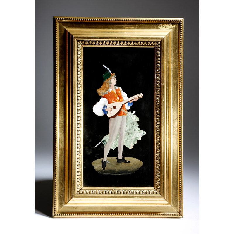 A late 19th century Italian Florentine pietra dura plaque, of a minstrel playing a mandolin, inlaid with various hardstones, including: lapis lazuli and malachite, 28.3 x 14.2cm, in a later gilt frame.