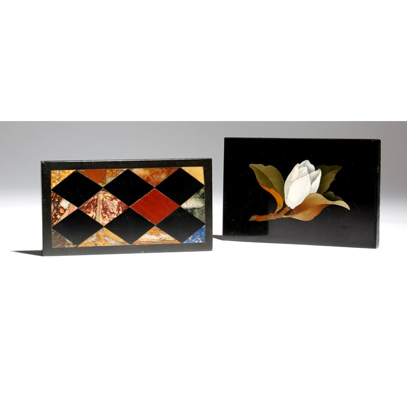 Two late 19th century Italian pietra dura paperweights, one inlaid with a flower, the other with specimen marbles in a geometric lozenge design, 12.3cm wide (max). (2)
