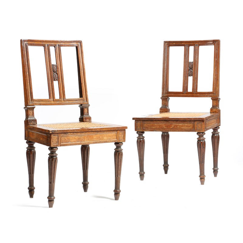 A pair of Italian walnut Neo-classical side chairs, with fruitwood dot inlay and floral marquetry, the rectangular back carved with leaves, above a caned seat and on stop fluted legs, late 18th century, possibly Piedmontese. (2)
