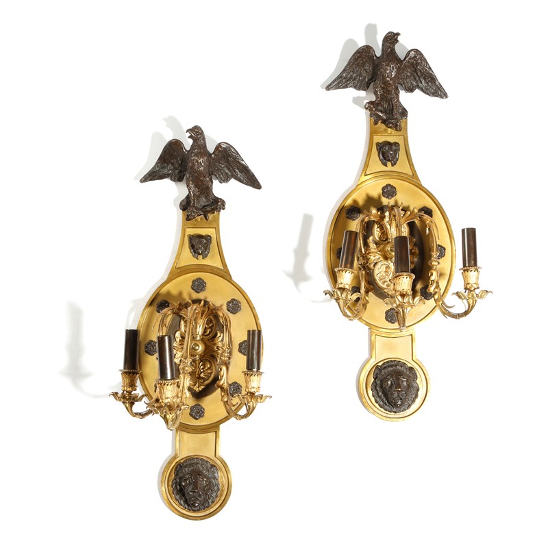 A pair of Empire style gilt and patinated bronze three-light wall appliques, each with an eagle surmount, above a panther's head and three leaf scroll branches, with stiff leaf nozzles, above a lion's mask base, 83cm high, 33cm wide. (2)