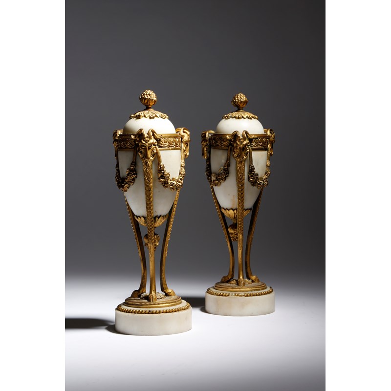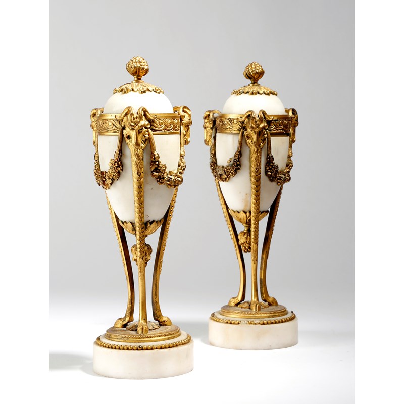 A pair of white marble and ormolu cassolettes in Louis XVI style