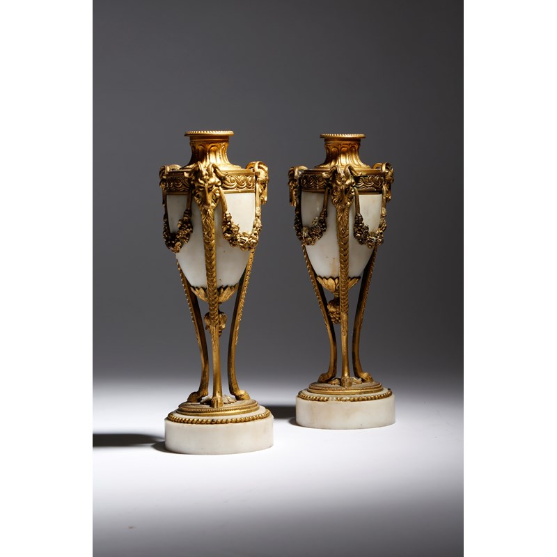 A pair of white marble and ormolu cassolettes in Louis XVI style, each in the form of an athenienne, with reversible tops with a bud finial and a candle sconce, the bodies decorated with swags of flowers and with ram's head monopodia supports, 19th century, 26.8cm high. (2)