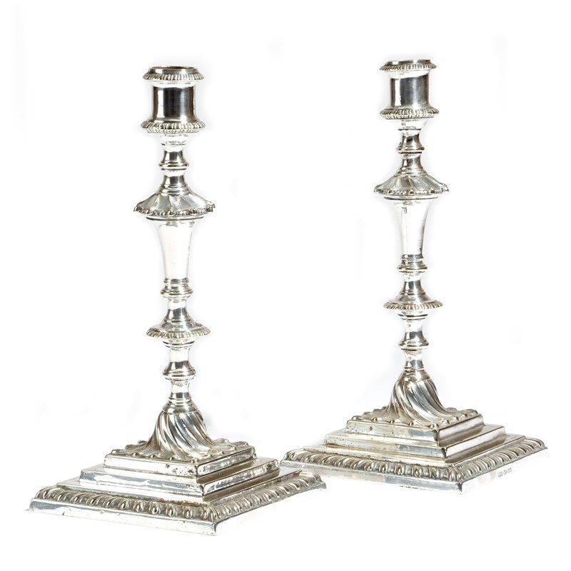 A pair of George III style candlesticks, with a turned nozzle above a batswing knop and a conforming base and a stepped plinth, stamped 'MAPPIN WEBB' '&CO' 'S&L', possibly Paktong or silver plated, 25.2cm high. (2)