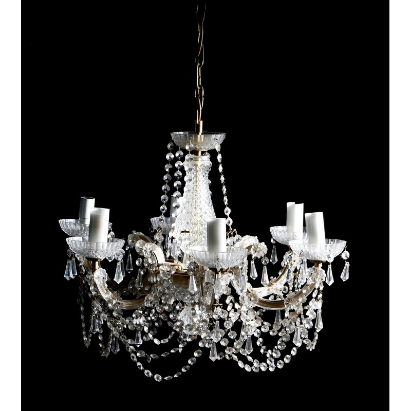 A pair of gilt brass and glass six-light chandeliers, hung with drops, each with a baluster stem, above scroll branches applied with flowerheads, the circular drip-pans hung with drops and lustres, above a ball pendant, 38.5cm high, 56.5cm wide. (2)