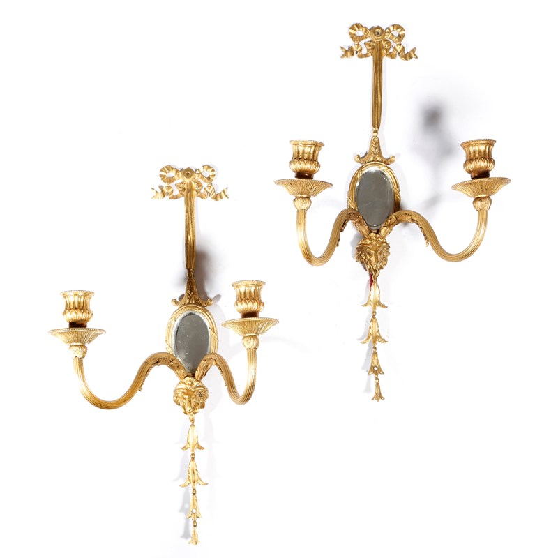 A pair of French ormolu twin-light wall appliques in Louis XVI style, each with a ribbon tied drape and husk back plate, inset with a bevelled oval mirror and with a ram's mask, with reeded leaf scrolling branches and fluted nozzles, the back stamped '75WS', late 19th century, 44cm high, 24cm wide. (2)