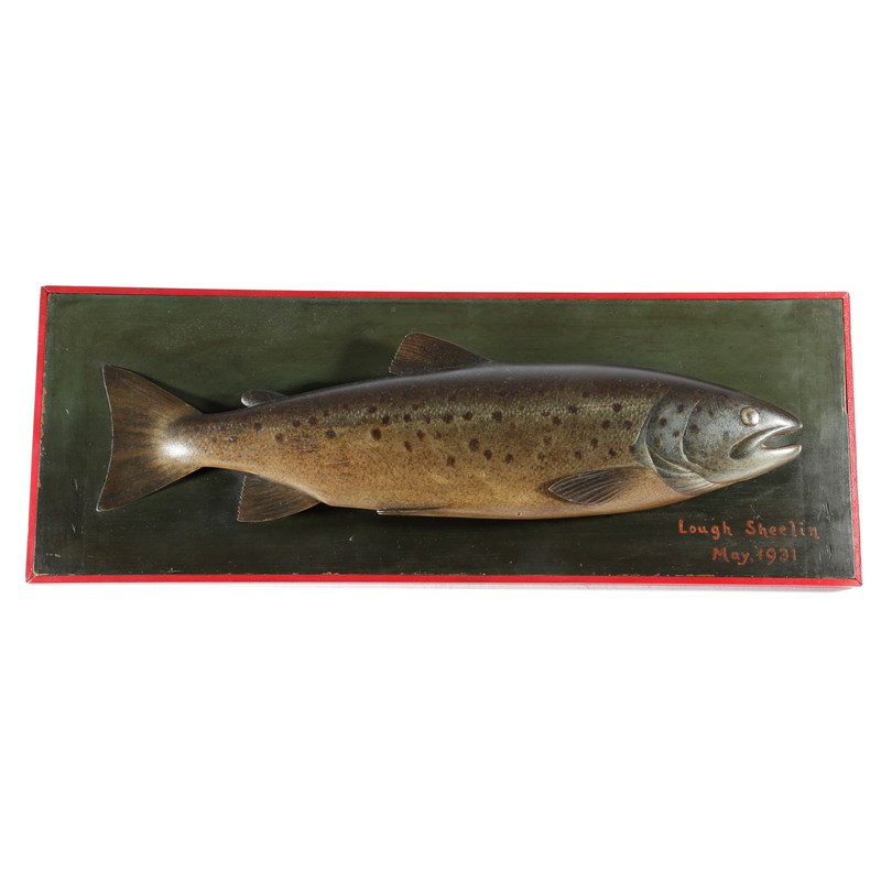 A George V Irish carved and painted wood half block model of a trout, mounted on a painted pine board, inscribed 'Lough Sheelin May 1931', 24 x 65.8cm.