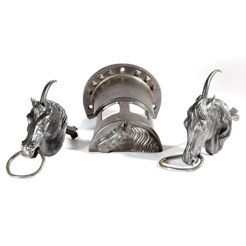 A pair of cast iron horse tethers, in the form of a horse's head with a ring in its mouth, together with a French cast iron harness rack, the base in the form of a horseshoe, the top with a horse's head, stamped 'CF with an anchor' and 'DEPOSE', 25.8cm high (max). (3)
