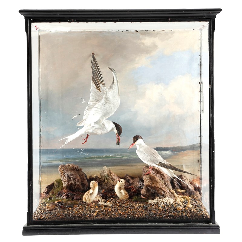 Taxidermy. An Edwardian Irish preserved group of a pair of Arctic terns with chicks by Williams of Dublin, mounted in a naturalistic seashore setting the backboard painted with a beach scene, the back with a paper label, in an ebonised glazed case, 82.5cm high, 73.2cm wide, 38.7cm deep.