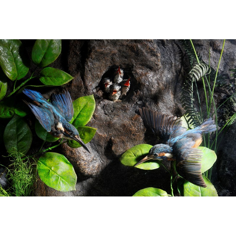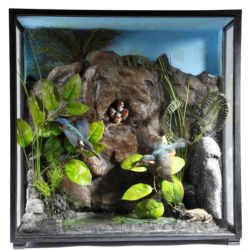 Taxidermy. A pair of preserved kingfishers, mounted in a naturalistic pond setting, with their four chicks emerging from a nest in the riverbank, with an attendant frog, in an ebonised and glazed case, the birds Victorian, the case and setting later, 63.9cm high, 62.4cm wide, 22.7cm deep.