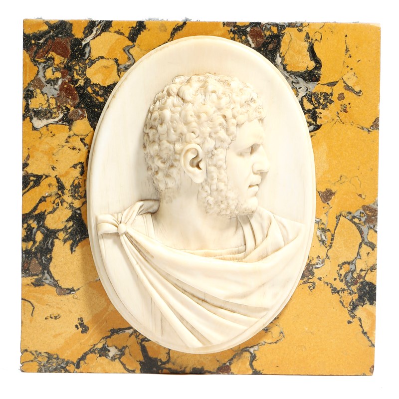 λ A 19th century Italian ivory Grand Tour portrait bust of the Roman Emperor Caracalla, carved in relief, 8.2 x 6cm and mounted on a later faux Siena marble scagliola plaque.