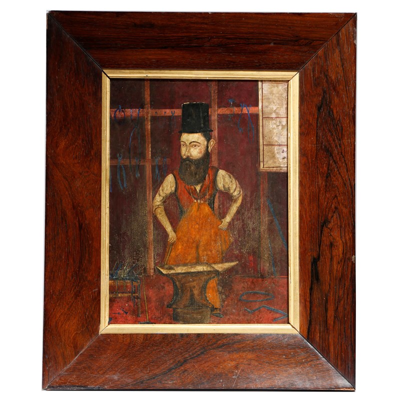 λ Russian School (late 19th century). A naive oil on board painting of a blacksmith, in his forge, sporting a beard and a top hat, 27.9 x 20.3cm, in a rosewood frame.