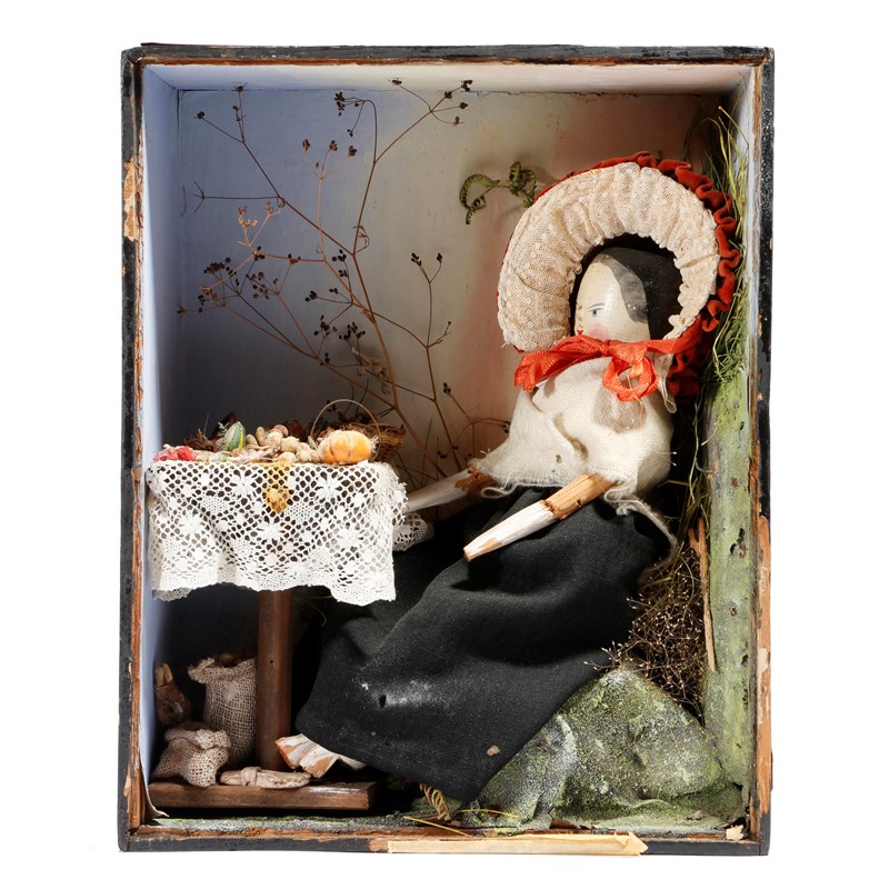 A Victorian pedlar type peg doll, of painted pine, wearing a ribbon tied bonnet, sat at a table offering her produce of vegetables, nuts, bread and cheese, in a glazed ebonised case, with a painted and naturalistic interior, 32.3cm high, 26cm wide, 14cm deep.
