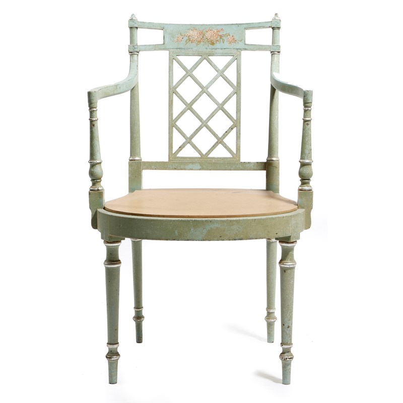 A painted open armchair in George III style, the top rail decorated with flowers, above a lattice splat back and a bell shaped seat, the rail stamped '6377'.