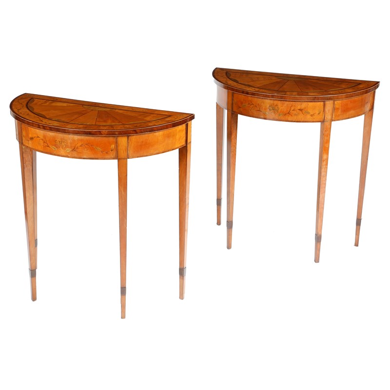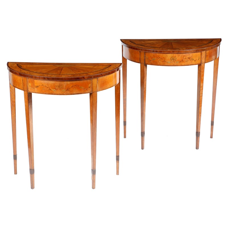 A pair of satinwood and marquetry demi-lune console tables in George III style