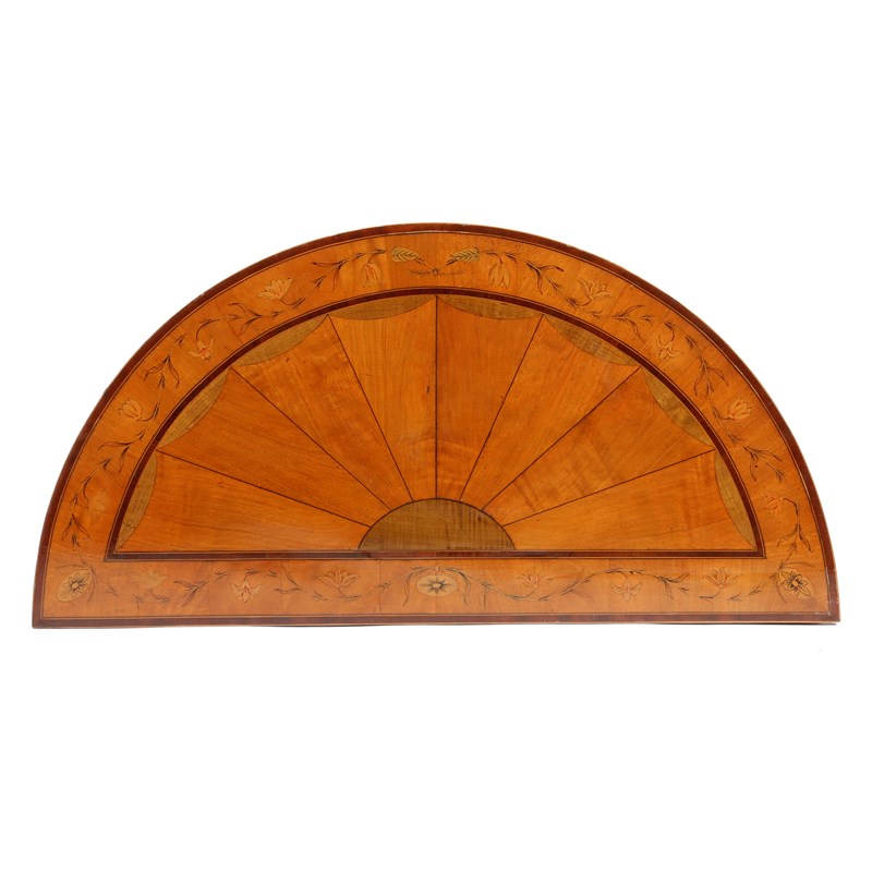 A pair of satinwood and marquetry demi-lune console tables in George III style, each with a fan top with crossbanding and inlaid with scrolling flowers and foliage with paterae, the frieze decorated with ribbon tied flowers on square tapering legs and applied ankles, possibly Irish, 19th century, 83.8cm high, 80.3cm wide. (2)