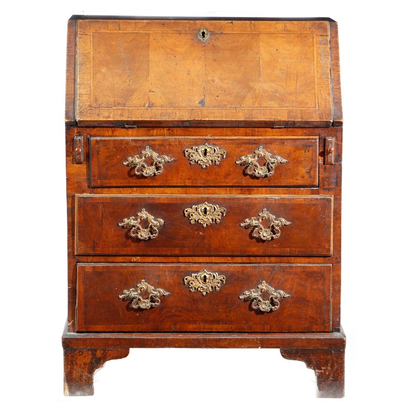 A George II walnut bureau, with cross and feather banding, the hinged fall revealing a fitted interior with holes and pigeonholes, above three long graduated drawers and bracket feet, 93.1cm high, 70.9cm wide, 44.3cm deep.