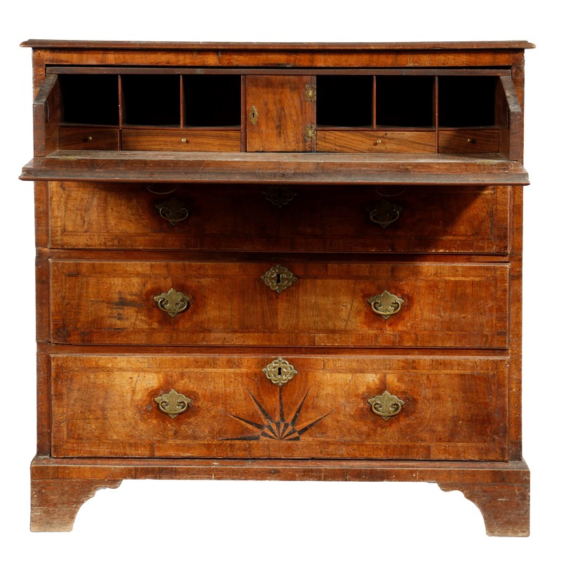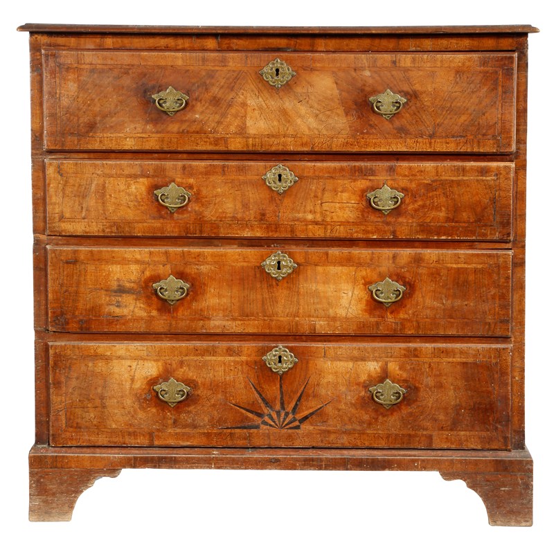 An early 18th century walnut secretaire chest, cross and feather banded, the quarter veneered top above a secretaire fitted with pigeonholes and four drawers and a central cupboard, above three long drawers, the lowest inlaid with a marquetry sunburst, 103.7cm high, 106cm wide, 52.5cm deep.