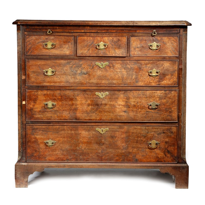 A walnut chest, the crossbanded top with a moulded edge, above a brushing slide, with three short drawers and three graduated long drawers, flanked by fluted angles, on bracket feet, 98.5cm high, 105cm wide, 56.3cm deep.
