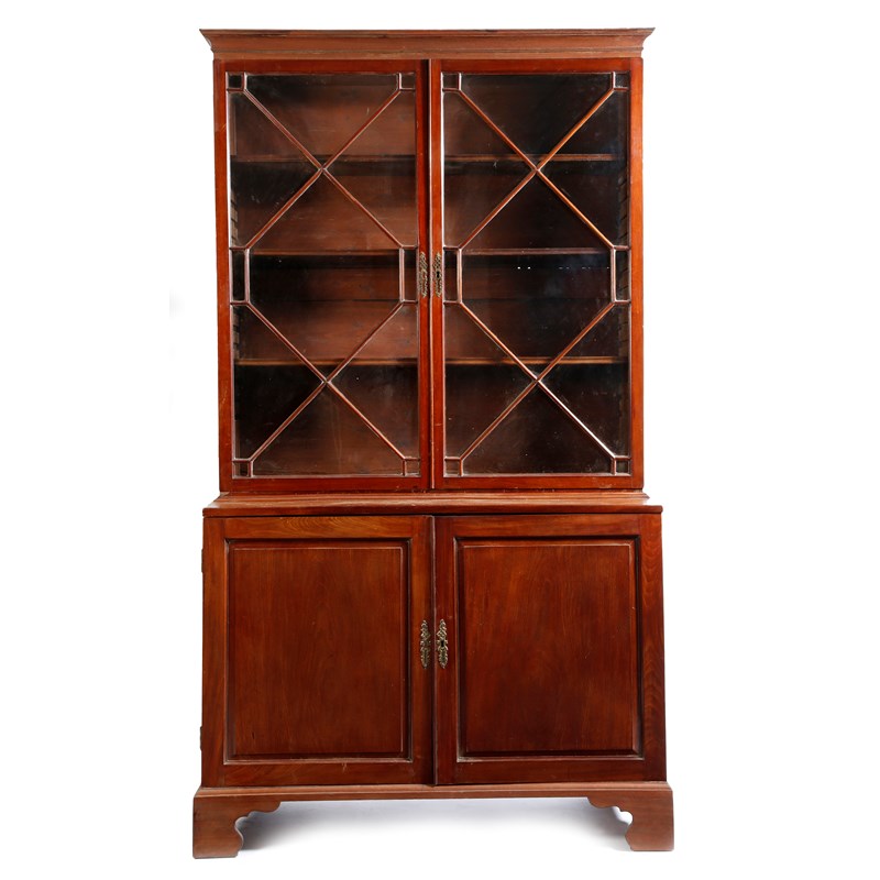 A George II mahogany bookcase cabinet, with a pair of astragal glazed doors enclosing three adjustable shelves, the base with a pair of fielded panel doors enclosing two slides, on bracket feet, 218.4cm high, 124.2cm wide, 55.8cm deep.