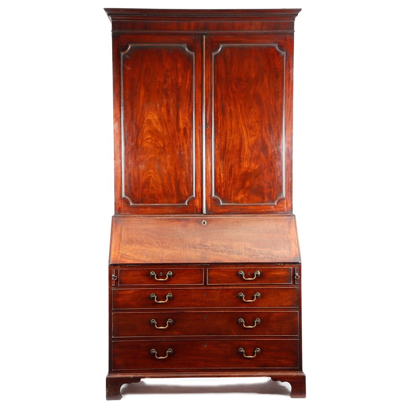 A George III mahogany bureau cabinet, with a dentil cornice above a pair of cupboard doors with outline mouldings, enclosing three adjustable shelves, with a hinged fall, the interior with twenty-one drawers, two pigeonholes and a central cupboard, above two short and three long graduated drawers, on bracket feet, 260.3cm high, 123.6cm wide, 57.7cm deep.