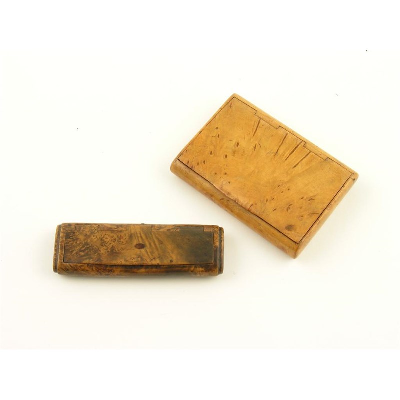 A 19th century Scottish amboyna oblong snuff box, with integral hinge and tortoiseshell lining, 3.5in (9cm) w, and a 19th century burr birch snuff box with integral hinge. (2)