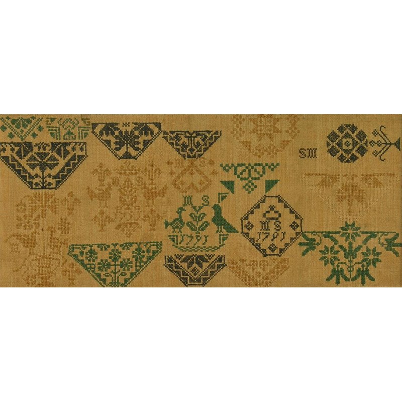 A late 18th century Quaker spot sampler, by M.S. 1791, worked in black, brown and green to a linen ground, decorated flowers, crowns, vase and birds, 9.5 x 21.5in (24 x 54.5cm). The initials 'M.S' have been identified to be those of Mary Storrs, who was a pupil at Ackworth School in Pontefract, from 1789 - 1791. Ackworth School was founded as a boarding school for Quaker boys and girls in 1779. Provenance: Mayorcas Ltd, 38 Jermyn Street, London.