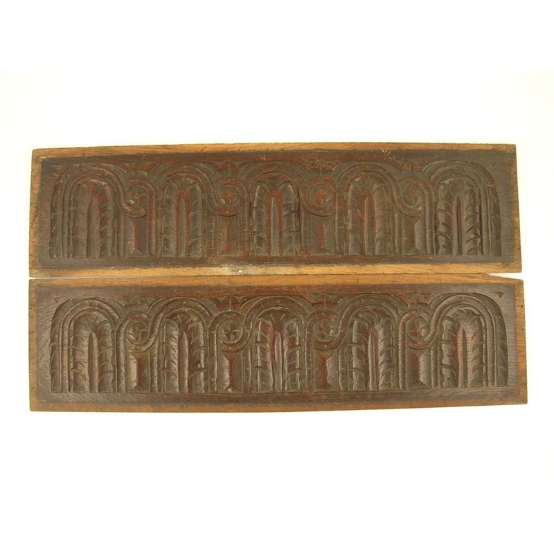 A pair of 17th century carved oak rectangular panels, decorated stiff leaves within arcaded and guilloche borders, 6.5 x 24.25in (16.5 x 61.5cm). (2)