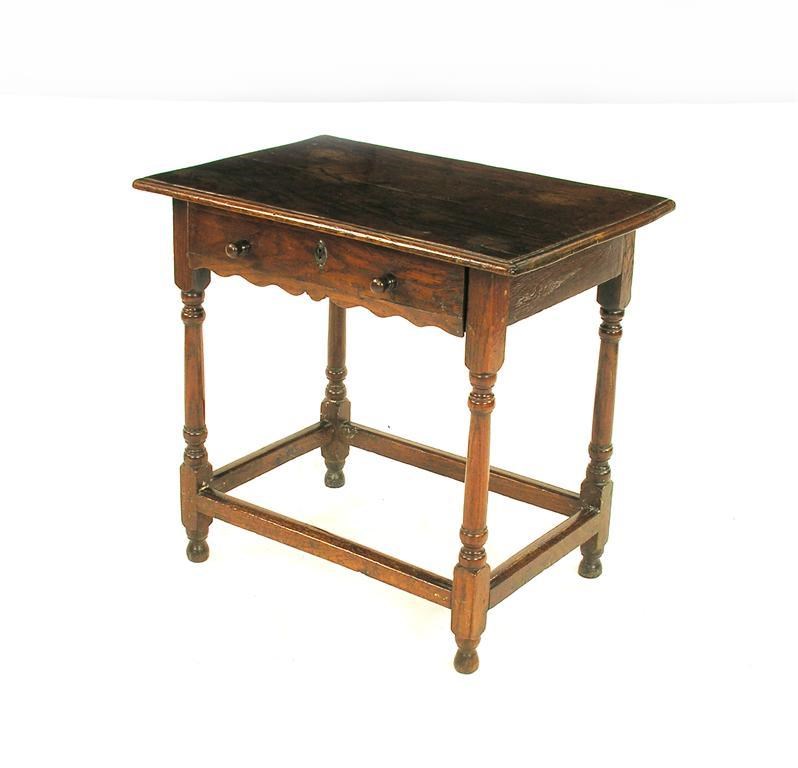 An oak side table, the moulded edge top above a frieze drawer on turned block legs united by peripheral stretchers, 18th century and later, 25.25in (64cm) h, 27in (68.5cm) w, 17.75in (45cm) d.