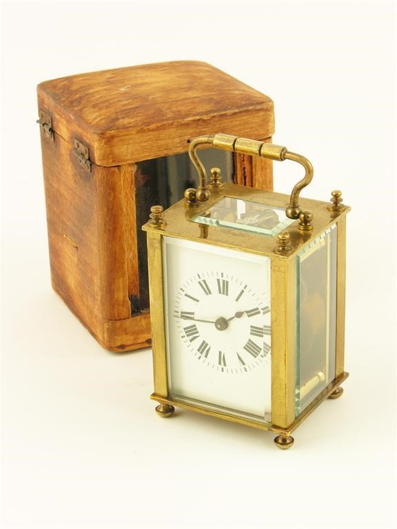 A French brass cased carriage clock, the platform lever escapement to an enamel dial, 4.5in (11cm) h. Winding key, in an associated case, leather missing.