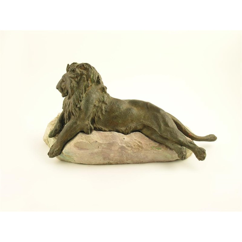 Prosper Lecourtier (1855 - 1924). A recumbent lion, bronze, on a sculpted marble base, signed (rubbed), 9.25in (23.5cm) h, 16.75in (42.5cm) w.