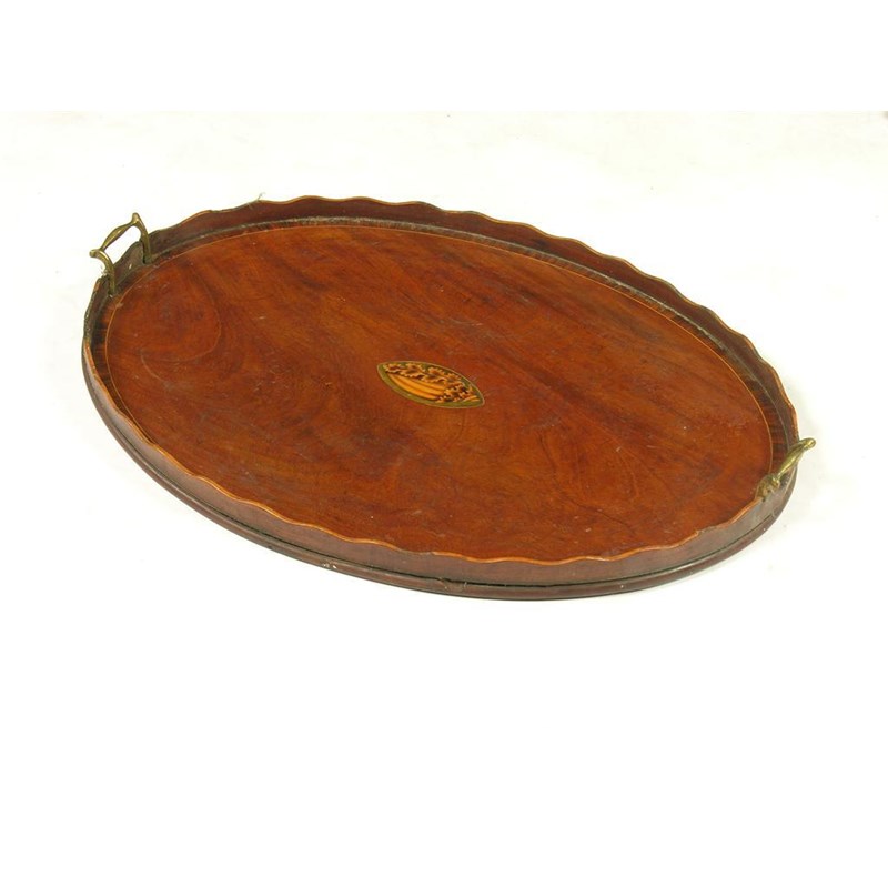 A 19th century mahogany oval drinks tray, the centre inlaid a marquetry conch shell to a rosewood banded edge and wavy gallery with gilt brass open handles, 28.25in (72cm) across handles.