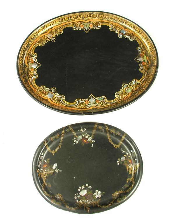 A 19th century papier mache oval tray, inlaid mother of pearl with gilt and painted highlights, 23.75 x 19.25in (60 x 49cm), and a Victorian oval papier mache tray by Jennens & Bettridge, 16.75 x 13.75in (42.5 x 35cm). (2)