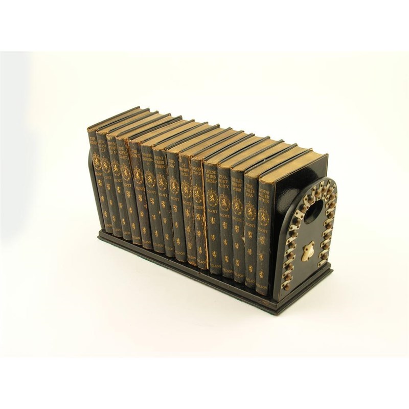 An ebonised, mother of pearl and brass stud mounted adjustable book rack, 13in (33cm) w, with 13 vols of The Works of Sir Walter Scott. (14)