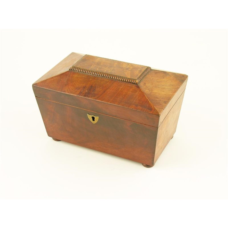 An early Victorian mahogany sarcophagus shape tea caddy, the interior with two lidded compartments, 5.75in (14.5cm) h, 9in (23cm) w.