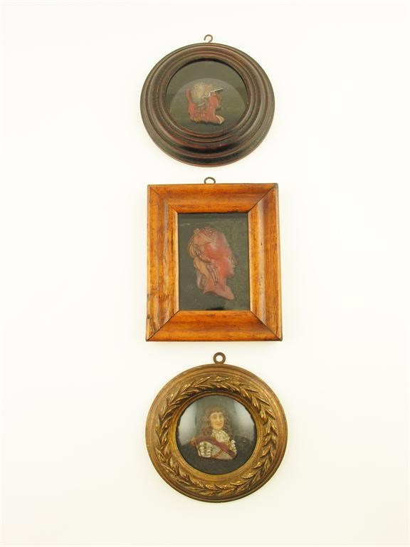 A wax profile bust of a lady, the verso inscribed 'Miss Martha Washington, No4,' 3.25in (8cm) h, another 'Carlo Emanuel III', and a third of depicting Minerva, the verso with paper label 'Nell Gwynne.' (3)