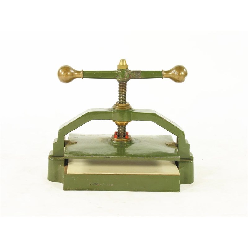 A painted cast iron book press, the handle with brass finials, the underside cast a lion and the letter I in a shield, 23.5in (60cm) w.