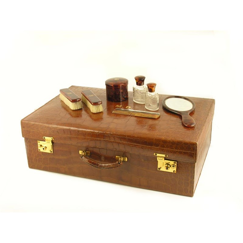 A crocodile skin travelling case, stamped 'Goldsmiths & Silversmiths Co. Ltd. 112 Regent Steet, W,' the silk lined interior part fitted with tortoiseshell back hand mirror, pair of long handled brushes, a pair of rectangular brushes, a cylindrical jar and cover and a pair of engraved glass scent bottles, all inlaid 'MD', some stamped 'FINNIGANS, BOND ST, with canvas slip, 26in (66cm) w.