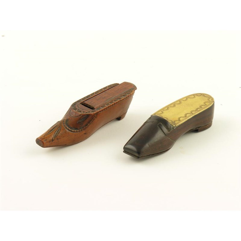 A 19th century rosewood shoe snuff, with an engraved brass hinged cover, the heel with brass tack inlay, 3.75in (9.5cm) l and a 19th century chip craved boxwood shoe snuff, with sliding cover, 4in (10cm) l. (2)