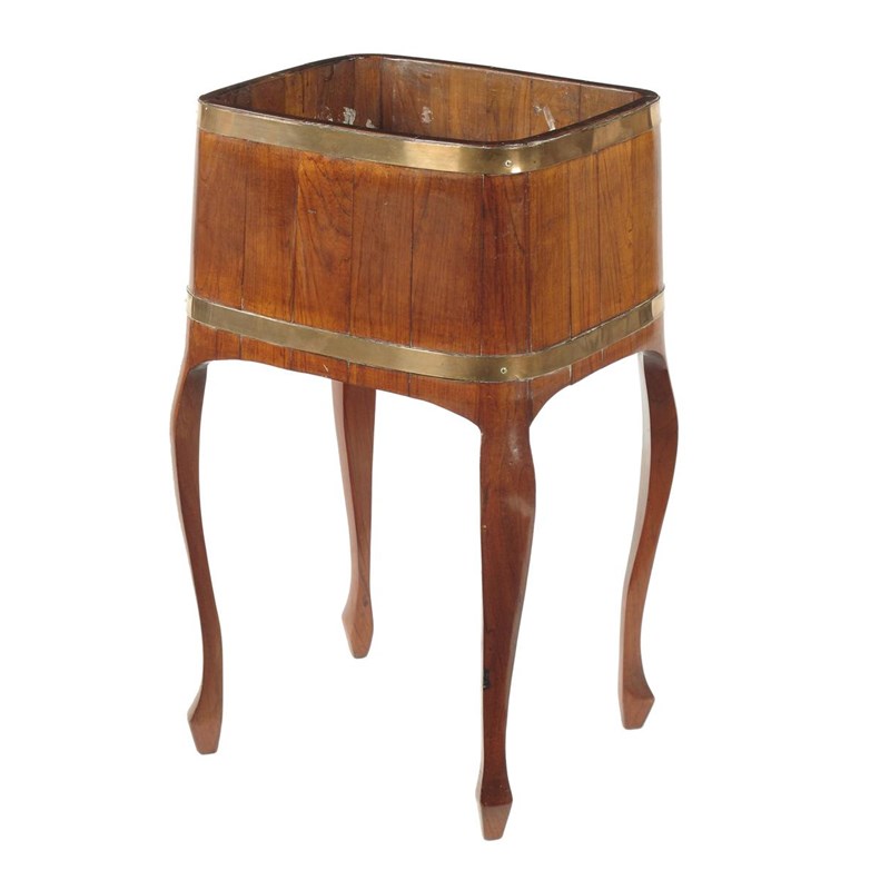 A teak and brass bound jardiniere, on cabriole legs, early 20th century, 29.5in (75cm) h, 16.75in (42.2cm) w, 14.5in (36.8cm) d.