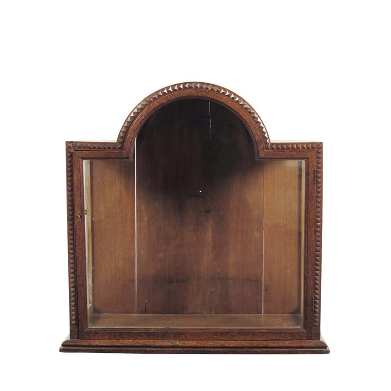 An Arts & Crafts oak table top display cabinet, the broken arch top to a carved pyramidal edge, on turned bun feet, 28.5in (72.5cm) h, 28in (71cm) w, 12in (30.5cm) d.