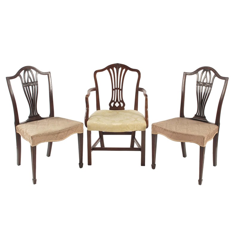 A pair of George III mahogany 'Hepplewhite' side chairs, each with an undulating top rail above a pierced splat with a carved tablet with husks and an oval patera, to a stuffed-over serpentine front seat on panelled square tapering legs to socket feet, together with a mahogany open armchair. (3)
