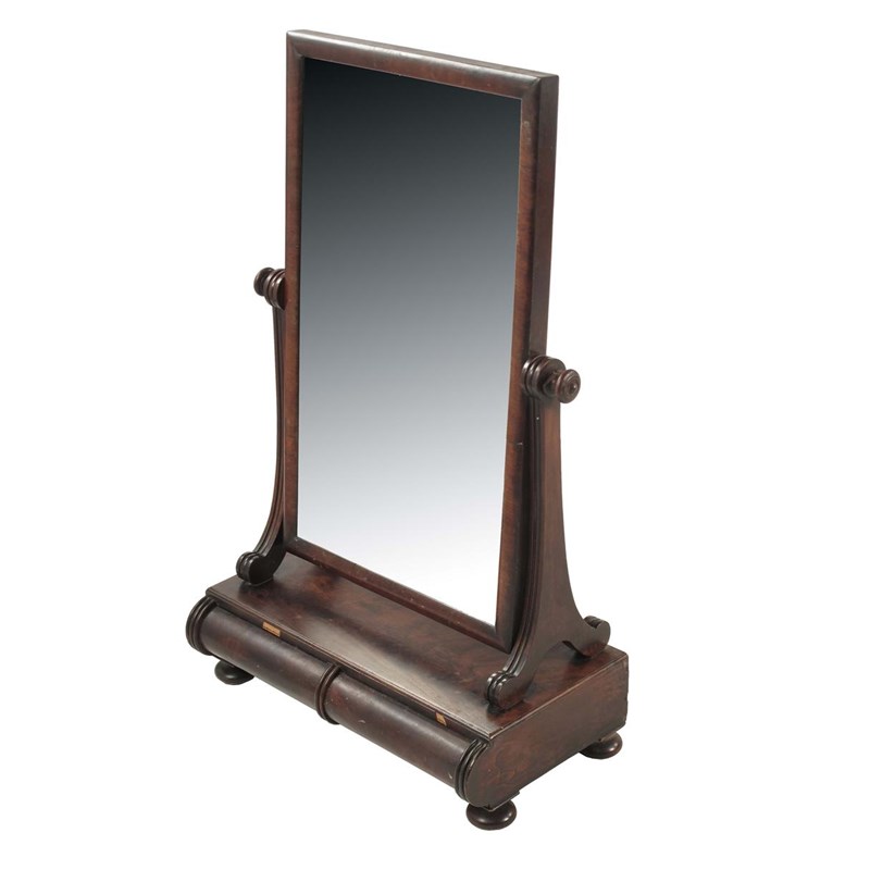 An early Victorian mahogany toilet mirror, the rectangular plate to reeded scroll supports, the box base fitted two cushion frieze drawers on disc feet, 32in (81.5cm) h, 19.5in (49.5cm) w, 11in (27.6cm) d.