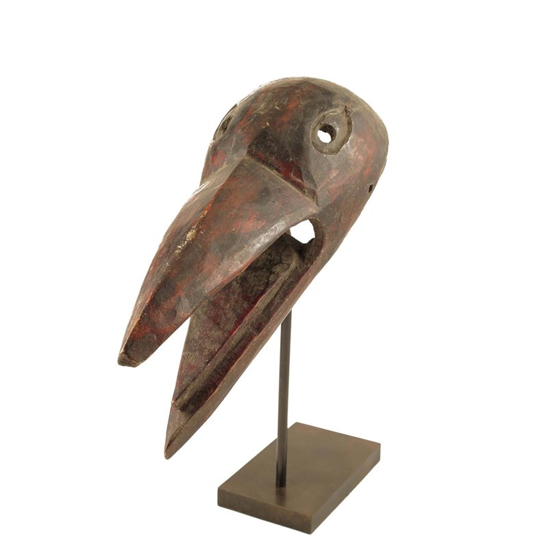 A wood and polychromed bird mask, with tear drop eyes to an open beak, Nepal/North American?, 14in (35.5cm) l, on a later stand. (2)
